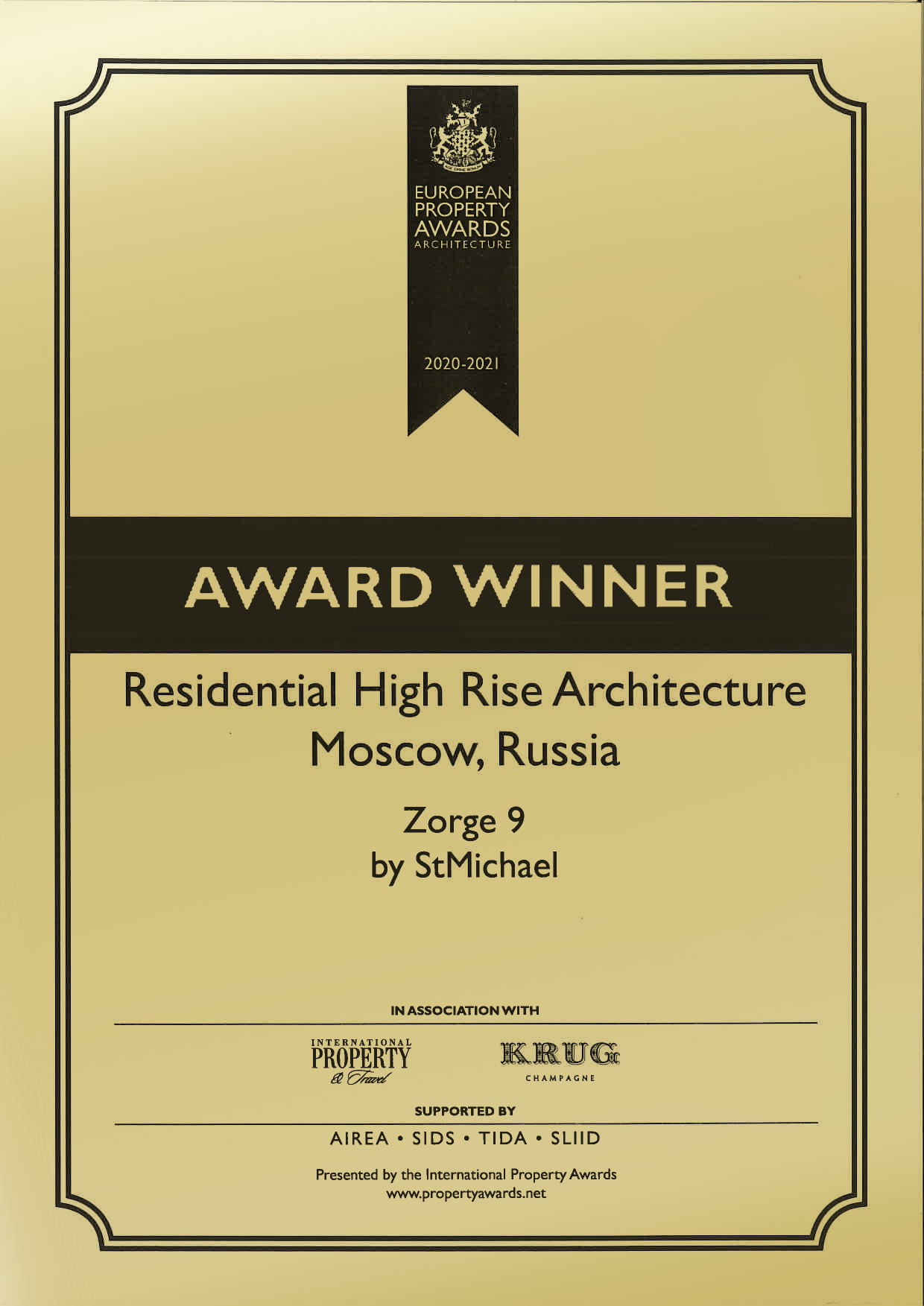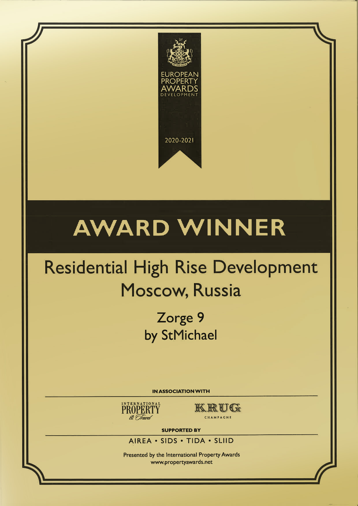 European Property Awards — самая престижная профессиональная награда в сфере недвижимости в Европе. Премия существует 27 лет, в ее жюри входят 80 независимых экспертов, которые оценивают проекты по таким критериям, как дизайн, качество, сервис, инновации и оригинальность. Возглавляют жюри члены Палаты Лордов в Парламенте Великобритании.