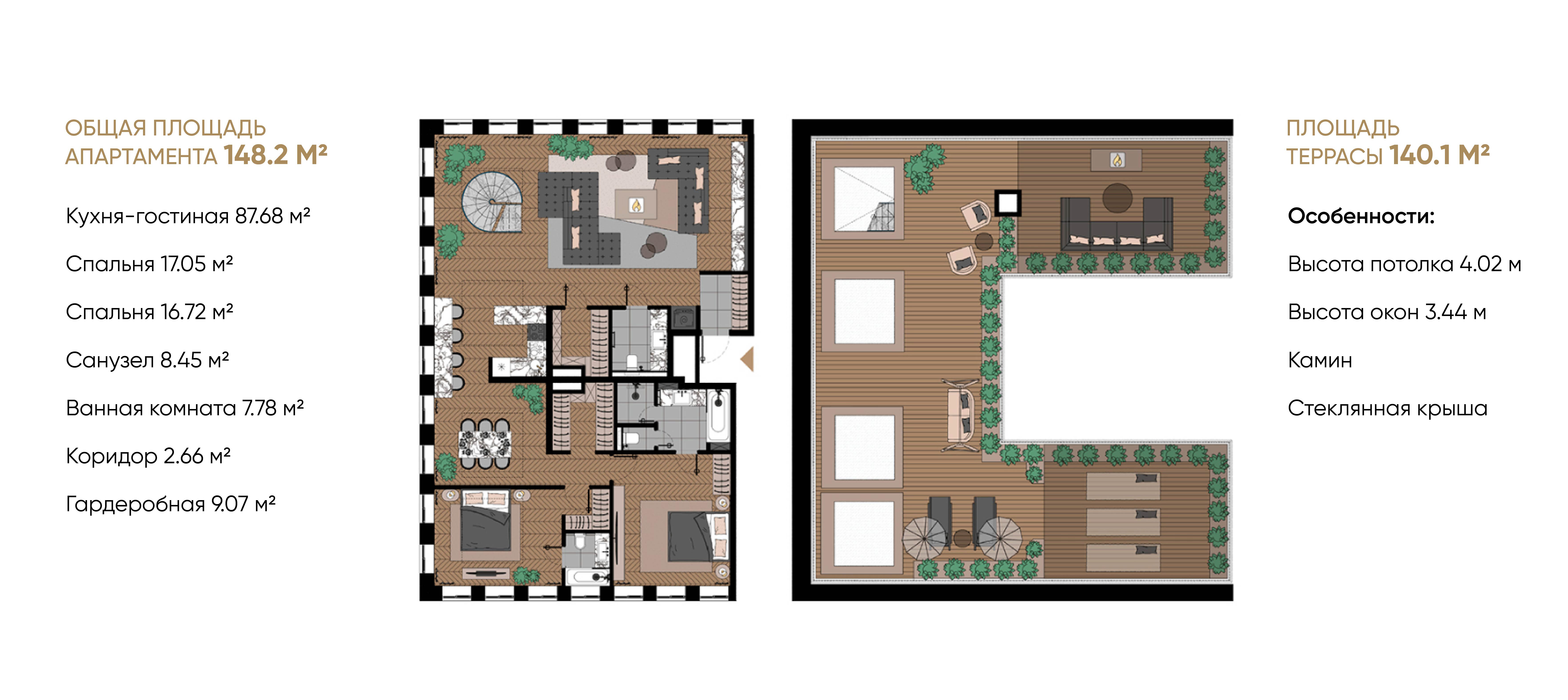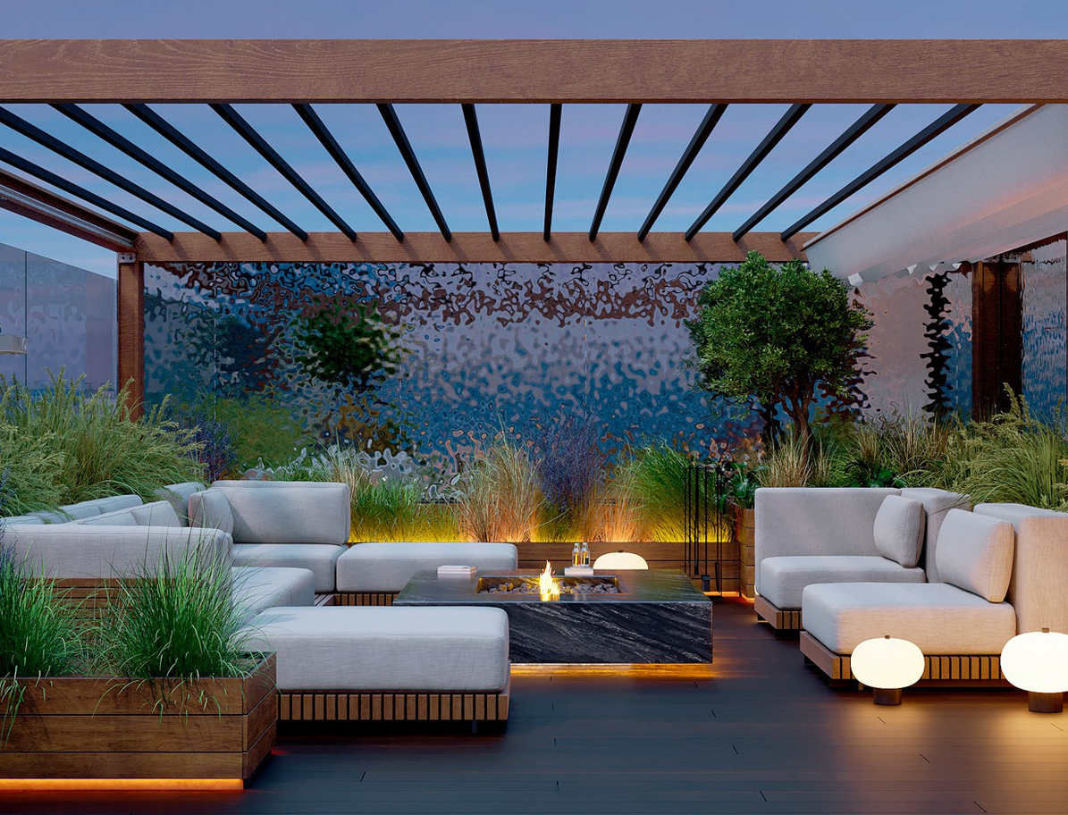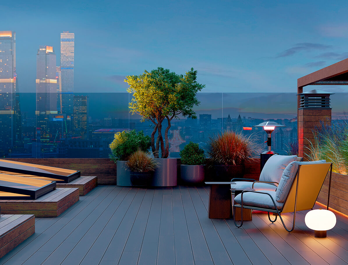 Владельцы эксклюзивных лотов на самом верхнем этаже имеют выход на собственную террасу на кровле прямо из апартамента. Личная терраса открывает массу возможностей: чтение на рассвете, йога на свежем воздухе, ужин с друзьями с невероятным видом на Москва Сити, ВЭБ арена и центр Москвы.